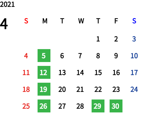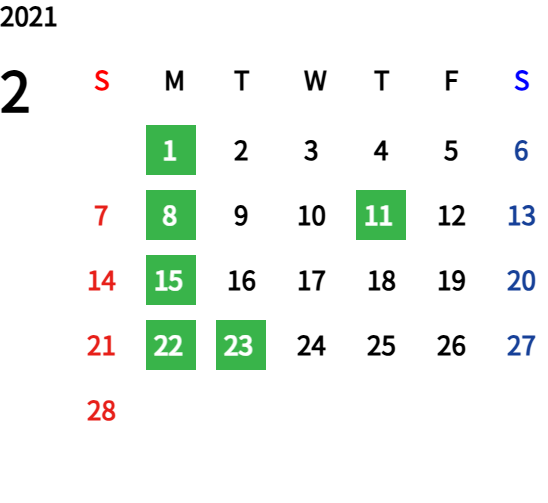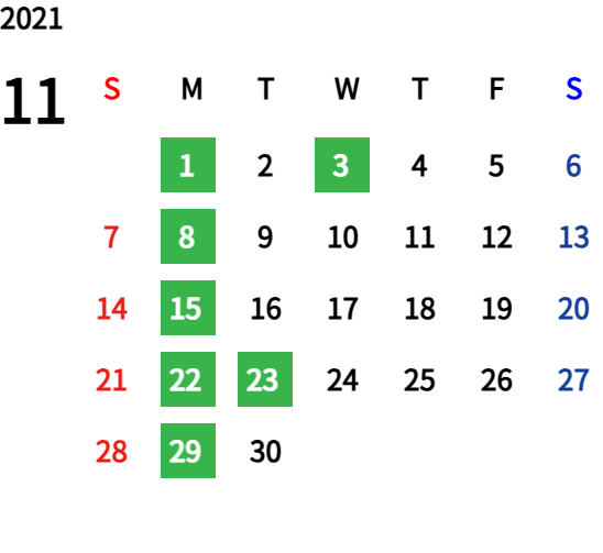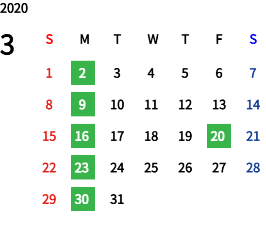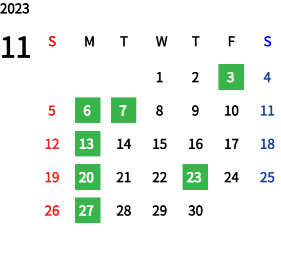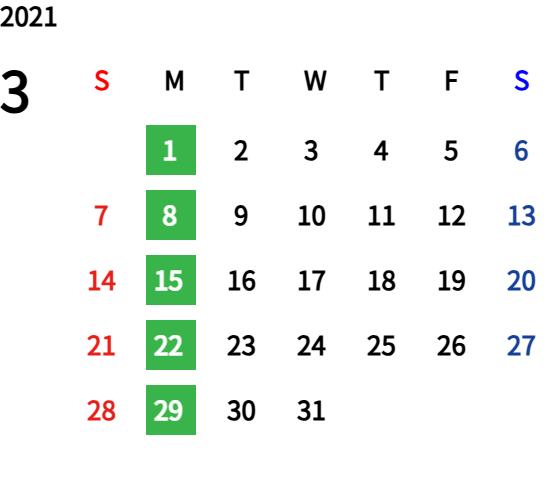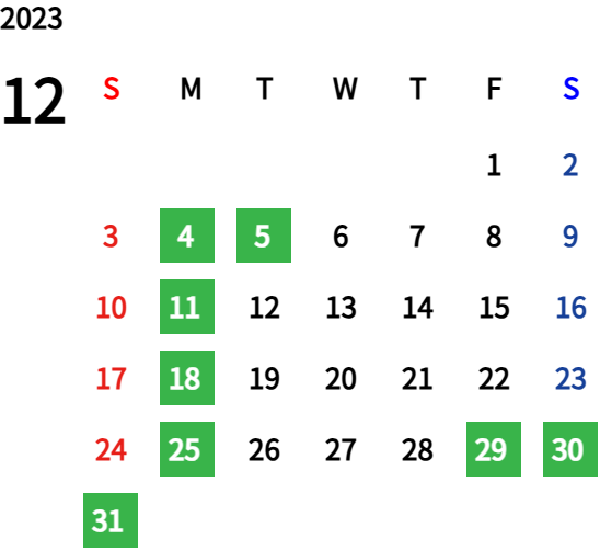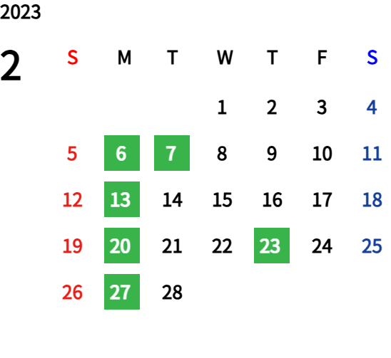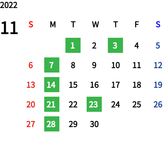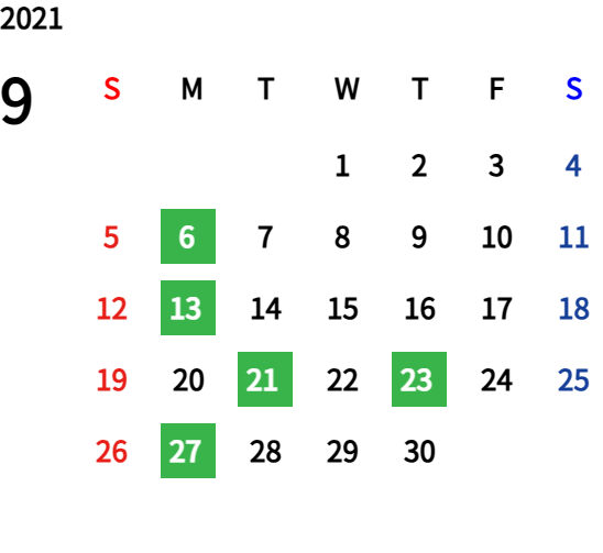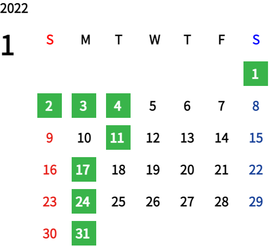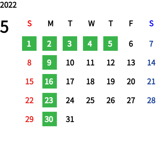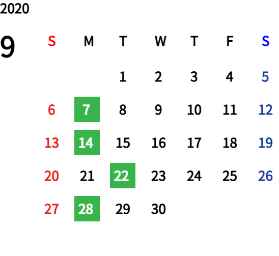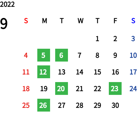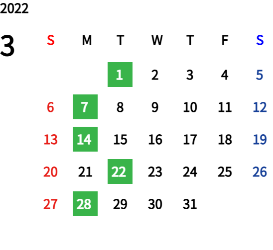ハッピーマンデーは全て休業となり、あわせて第一、第二、第三火曜日も定休日となります。詳しくはこちらをご覧ください。