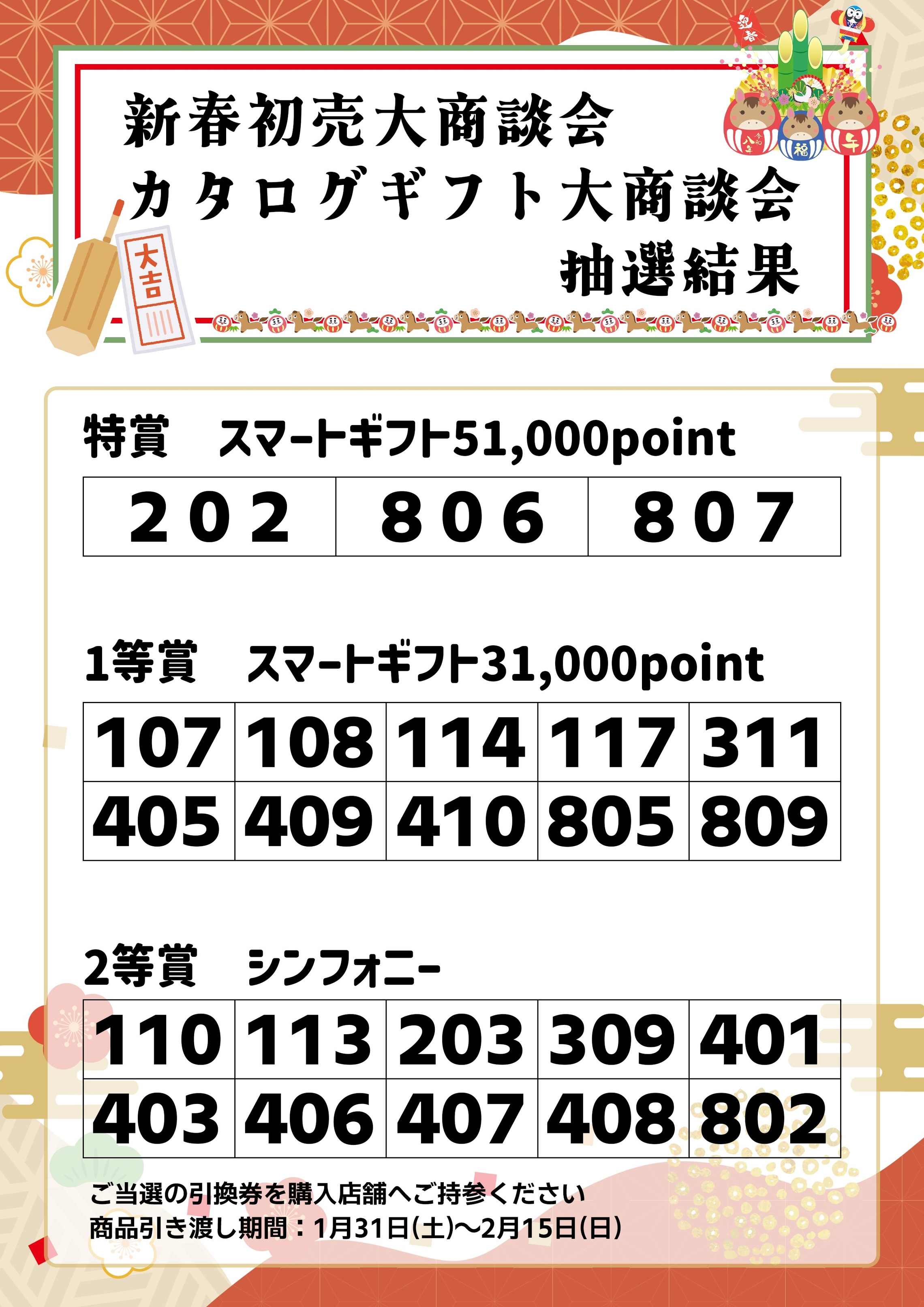 新春初売大商談会 カタログギフト大抽選会結果のお知らせ 2026.01.30 新春初売大商談会 こんにちは! 本部のミハラです! 1月6日から11日に実施した 新春初売大商談会の新車ご成約特典 カタログギフト大抽選会の抽選結果をお知らせいたします ご当選された方は 1月31日(土)~2月15日(日) の期間に購入店舗へ引換券をご持参ください ご成約いただいたみなさま ありがとうございました 前の記事へ 本部ブログ一覧に戻る 次の記事へ