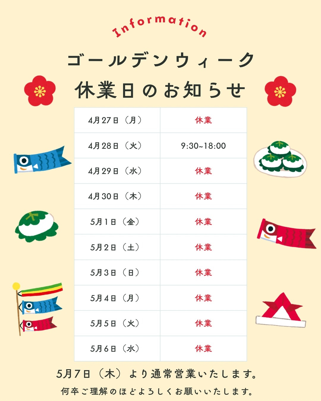 当店、休業日のご案内です